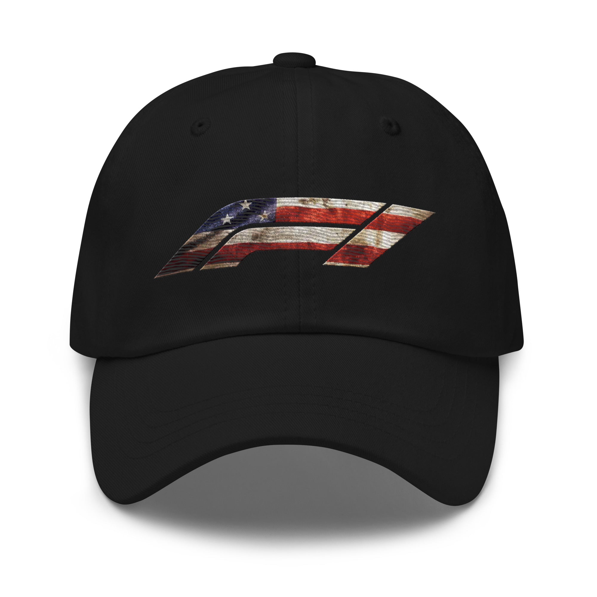 Our American Flag Formula 1 Embroidered Dad Hat blends motorsport passion with patriotic flair — classic fit, curved visor, and a weathered flag design that screams “Stars, Stripes, and Speed.”